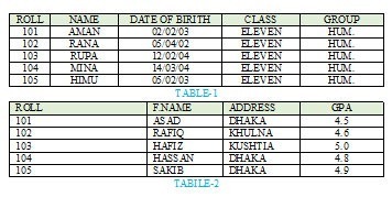 Table-1 এ শিক্ষার্থীর ব্যক্তিগত তথ্য সংরক্ষিত আছে (Roll, Name, D.O.B)।