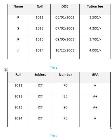 Table-2 এ শিক্ষার্থীর পরীক্ষার নম্বর সংরক্ষিত আছে (Roll, Marks)।