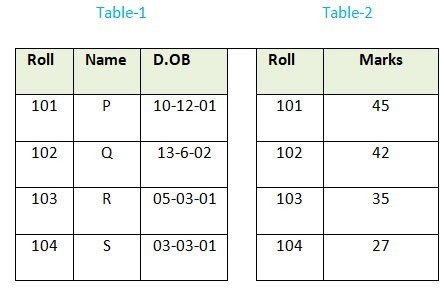 প্রাইমারি কী (Primary Key) হিসেবে 'ROLL': যেহেতু 'ROLL' ফিল্ডের মানগুলো অদ্বিতীয় এবং এটি প্রতিটি রেকর্ডকে অনন্যভাবে চিহ্নিত করতে পারে, তাই এটিকে উভয় টেবিলের প্রাইমারি কী হিসেবে বিবেচনা করা যায়। সাধারণত একটি টেবিলে একটি প্রাইমারি কী থাকে যা অন্য টেবিলে ফরেন কী হিসেবে কাজ করে।