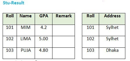 Entity-1: Stu-Result (Roll, Name, GPA, Remark)
