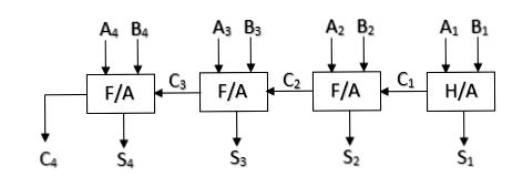 - বাকি তিনটি বিটের জন্য তিনটি ফুল অ্যাডার ব্যবহার করা হয়, যেখানে প্রতিটি অ্যাডার আগের বিটের ক্যারি যোগ করে A2, A3, A4 এবং B2, B3, B4 এর সঙ্গে যোগফল বের করে।